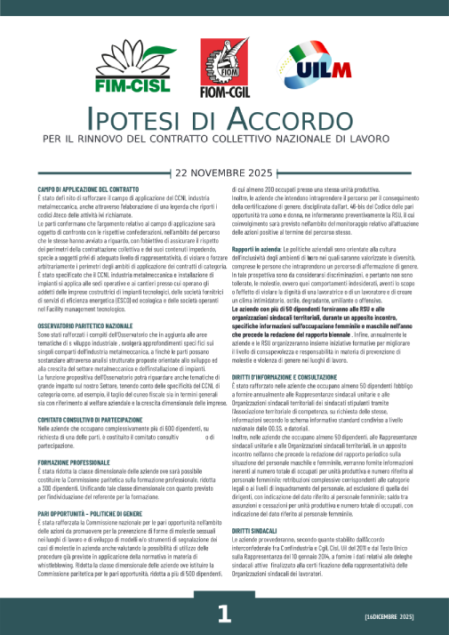 Ipotesi di Accordo per il Rinnovo del Contratto Collettivo Nazionale di Lavoro (CCNL) dell’Industria Metalmeccanica e dell’Installazione di Impianti. Definita il 22 novembre 2025 ed è promossa da FIM-CISL, FIOM-CGIL e UILM/UIL.